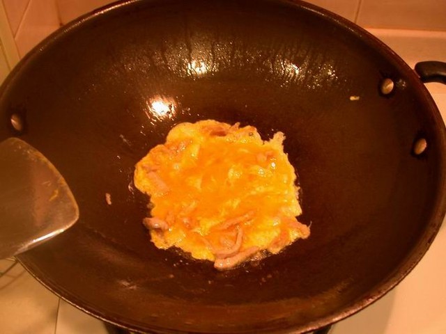 剛剛打散的雞蛋,記得倒入後不要急著翻炒,先讓雞蛋的一面可以稍微煮熟,有點像煎荷包