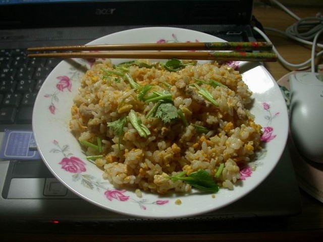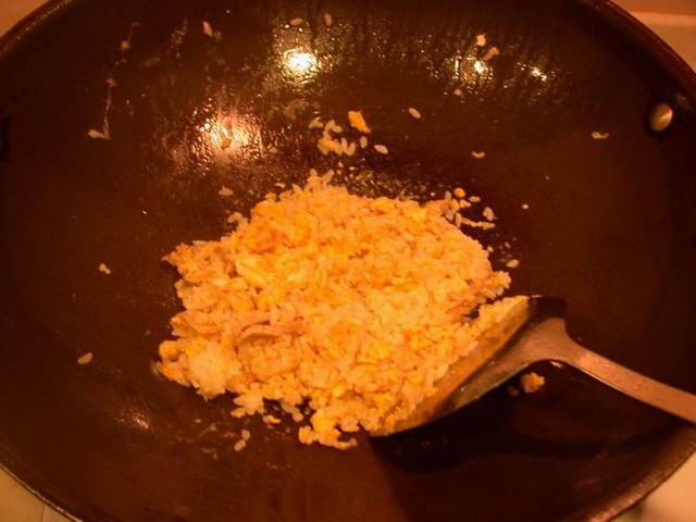 不會有人炒一份蛋炒飯加入一瓶醬油吧!),以及約20cc的水,然後就開始不斷翻炒(知道爲神