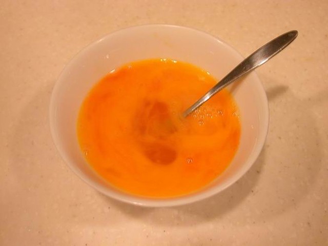 首先豬肉切絲後,怕待會手忙腳亂的話,可以先把2顆雞蛋打到同一個碗內,然後打散備用.